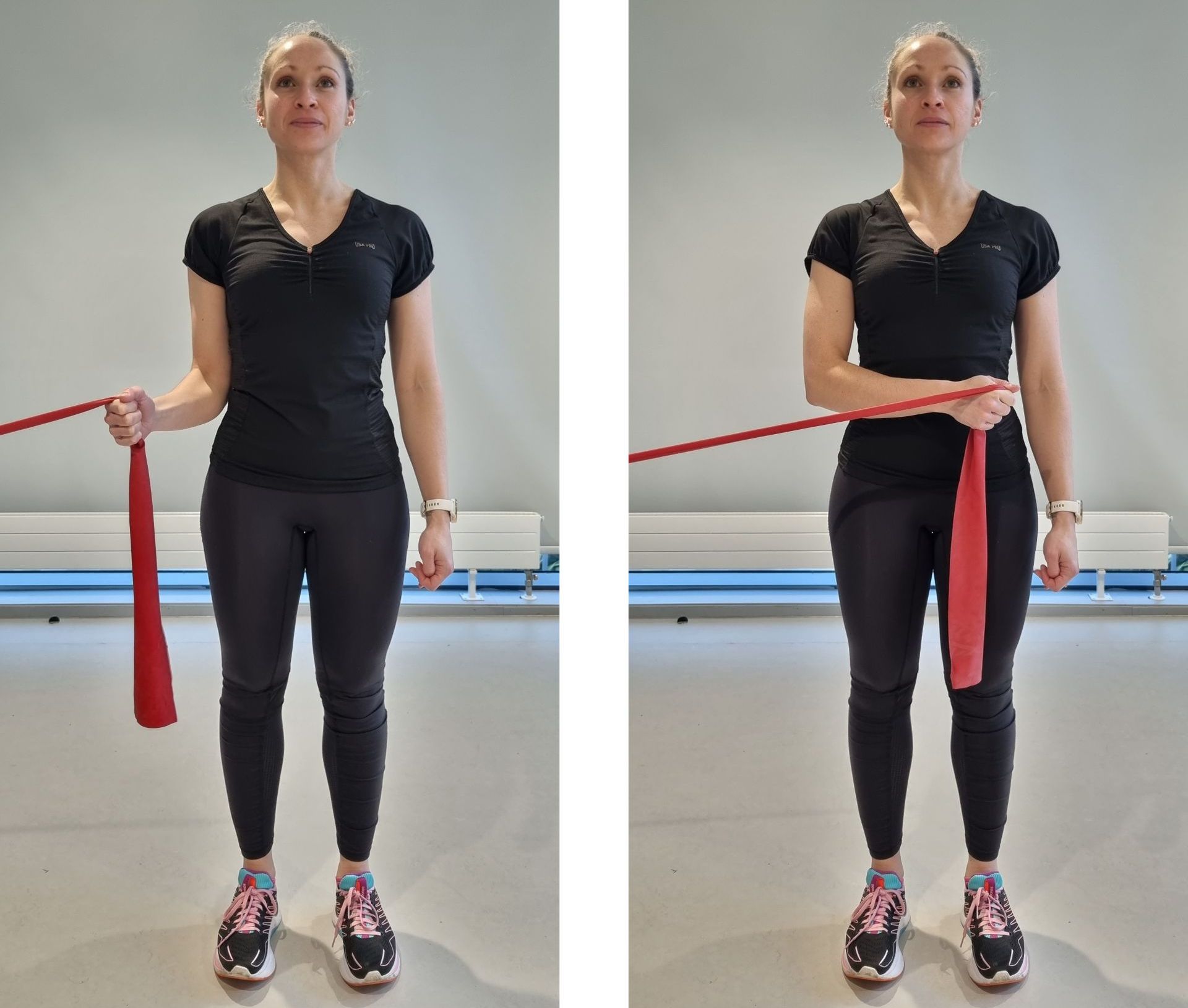 1) Hold the resistance band with your operated arm and take it forwards, stretching the band, as you feel able.